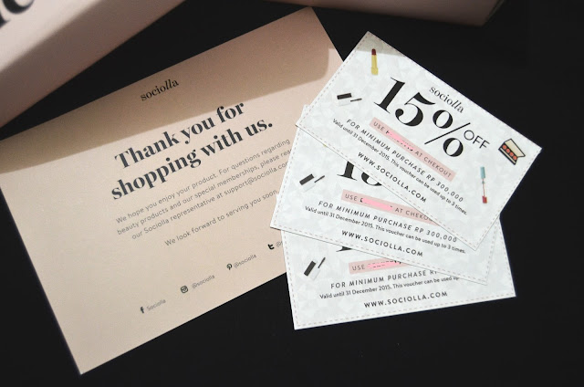 Terus pas dibuka, dapet card ucapan terima kasih karena udah belanja di Sociolla. Entah kenapa ya, sepengalaman gue belanja online, gue paling seneng kalo belanjaan kita dikasih card macam itu atau apa kek gitu walau hanya sekedar kartu ucapan. Kayak seneng aja gitu hee. Di baliknya ada semacam brush guide gitu hihi lucu yaaaa :3