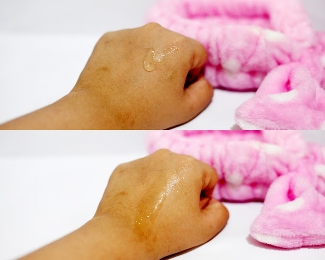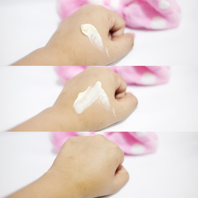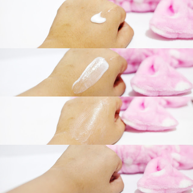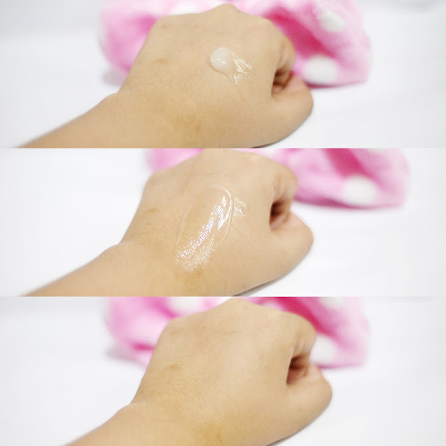 Konsistensinya seperti gel, warnanya putih butek gitu, dan nggak ada wanginya. Gue pakai satu setengah pump untuk ke seluruh wajah. Mudah meresap ke kulit.