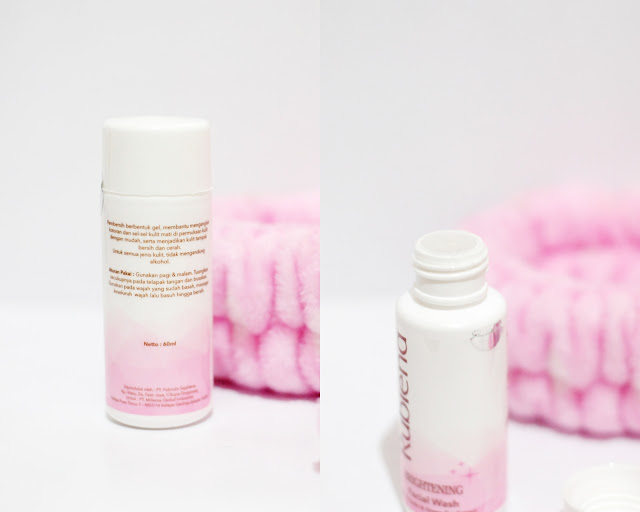 Kemasannya kurang lebih mirip sama Brightening Cleansing Lotion-nya hanya saja dia didominasi warna putih dan pink dengan tulisan berwarna merah marun. Dia juga nggak ada box-nya. Ukuran botolnya 60ml dengan tutup botol ulir biasa. Terbuat dari plastik yang cukup keras, dan lagi-lagi agak susah ngeluarin produknya karena susah di-squeeze.