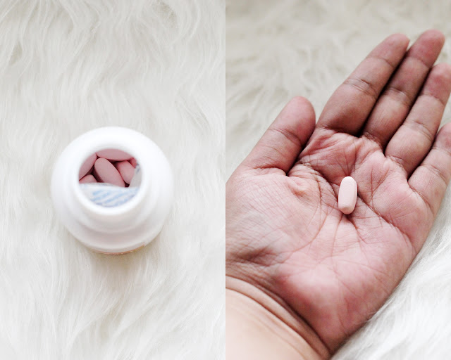 Tabletnya berwarna pink muda dengan ukuran yang nggak terlalu besar dan melonjong. Buat gue ukuran segini masih mudah ditelan. Nggak ada rasa-rasa pait juga seperti obat pada umumnya. Nggak ada aroma sama sekali. Dalam satu botol ini terdapat 30 tablet yang dapat dikonsumsi satu hari 1 tablet selama 30 hari. Jadi pas banget lah satu botol buat sebulan.