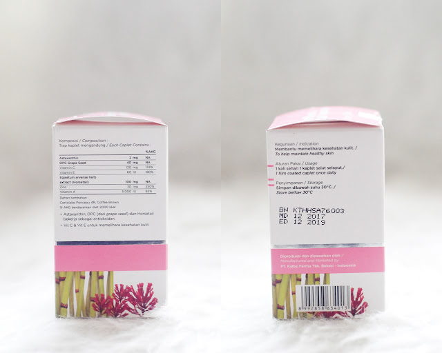 Kemasannya datang bersama dengan box yang didominasi warna putih dengan aksen pink. Di bagian kanan terdapat informasi komposisi/ingredients yang terdapat di dalam produk ini. Di bagian kirinya ada aturan pakai dan tanggal kedaluwarsa.
