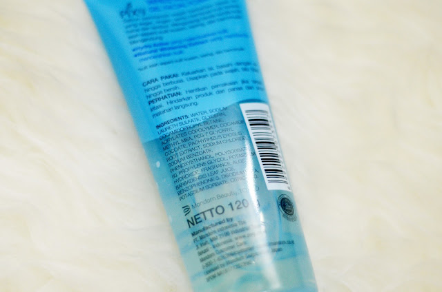 Kemasannya gemes banget ya. Didominasi warna biru berbahan plastik yang transparan jadi bisa lihat isi produknya yang bening. Di satu kemasan ini sudah cukup lengkap dari keterangan cara pakai, deskripsi, ingredients, dan nomor BPOM. Ukurannya 120g dengan tutupan flip seperti kemasan face wash pada umumnya.