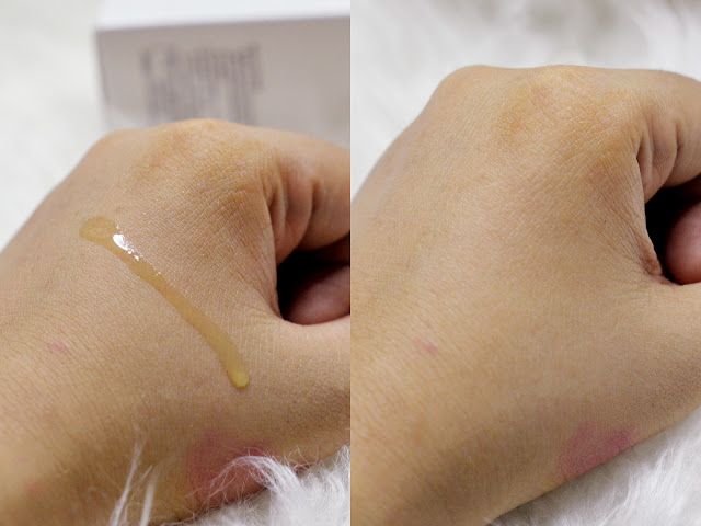 Teksturnya cair seperti air berwarna kuning bening. Katanya kemungkinan warna produk bisa berubah menjadi kuning pekat, itu hal yang normal ya untuk serum Vitamin C. Untuk mencegahnya bisa taruh di tempat yang sejuk agar tidak terjadi oksidasi. Aromanya seperti obat vitamin C, jadi ada wangi jeruk gitu. Sama sekali nggak ganggu kok wanginya ketika dipakai di wajah. Setelah produk dibaurkan ke seluruh wajah, kulit jadi terasa sedikit lengket tapi nggak berlebihan. Karena dia cepat meresap ke kulit jadi rasa lengketnya pun sebentaran aja.