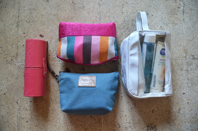 NAH untuk keperluan make up dan skin care gue pisah di tiga tempat. Pouch besar yang gue dapetin dari Wardah dan berwarna putih itu gue isiin barang-barang keperluan skincare, kalo yang pink untuk make up yang base atau ya semacam buat dipake pas awal doang dan gue taro di rumah/hotel, dan yang biru buat keperluan touch up, jadi buat ditaro di tas yang bakal gue bawa-bawa kalo gue bepergian. Kalo tabung pink itu udah tau lah yaaa buat naro brushes.