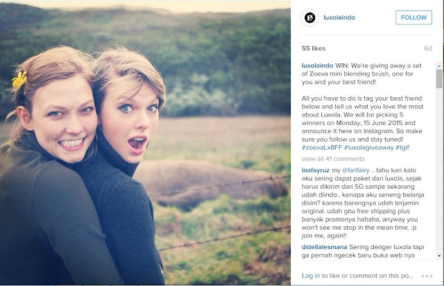 Nah, untuk kali ini, gue dapetin hadiah dari Luxola lagi! Tapi bukan karena belanja, melainkan melalui Instagram Giveaway! Jadiii giveaway kali ini diadakan dalam rangka Hari Persahabatan Sedunia pada tanggal 8 Juni. Luxola yang kerjasama dengan ZOEVA bakal ngasih a couple of mini blending brush from ZOEVA, one for you, and the other one for your best friend by tag your best friend (I was tag Syifa, of course!) and tell them what you love the most about Luxola. Waahhhhh isinya bakalan dari hati banget, lah, gue! Hahahaha. Becauseee I love everything about Luxola. So here what I wrote for this giveaway.