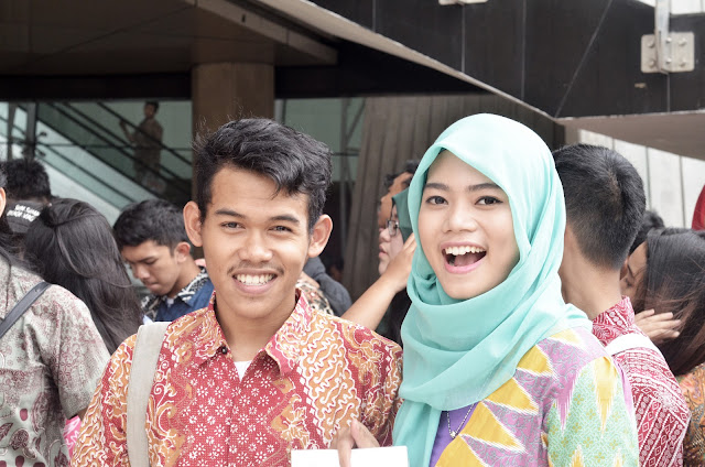 Oh iya, ada dresscode-nya loh! Yaitu pake batik! Jujur aja gue udah ga punya batik yang masih muat di badanku yang subur ini.. Akhirnya gue mencoba untuk memudahkan diri dengan memakai blazer yang waktu itu pernah beli di el-zatta, yang keliatannya motifnya kayak batik huahuahuahua. Yaudah deh gue hanya pake blazer itu, kaos abu-abu, jeans hitam, sepatu kets, dan kerudung abu-abu. Semoga ketje. Terus ada tamu bule yang kepincut ama gue.