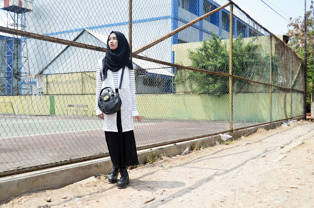 Just another my experience for taking my friend's outfit because her outfit is just great! Pemotretan dilakukan di bawah matahari super terik, which is I like it so much because the lighting would sooo great for taking pictures. Berhubung udah lama banget gak hunting foto (selama ini videoan mulu haha) jadi agak kebingungan gitu pas ngatur cahaya. Tapiii alhamdulillah hasilnya lumayan juga. So here the pics, guys! :D