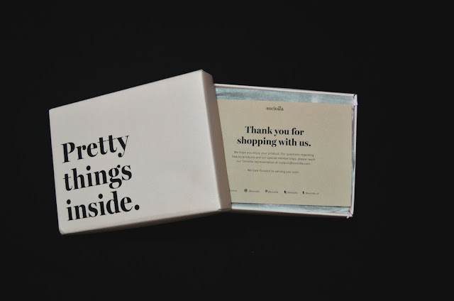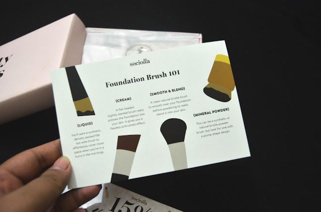 Terus pas dibuka, dapet card ucapan terima kasih karena udah belanja di Sociolla. Entah kenapa ya, sepengalaman gue belanja online, gue paling seneng kalo belanjaan kita dikasih card macam itu atau apa kek gitu walau hanya sekedar kartu ucapan. Kayak seneng aja gitu hee. Di baliknya ada semacam brush guide gitu hihi lucu yaaaa :3