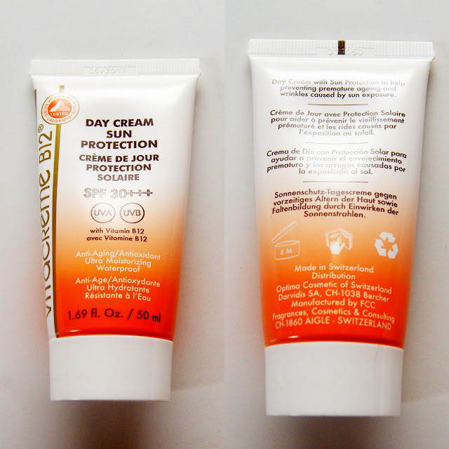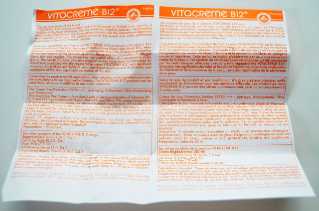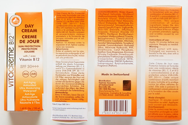 - Vitacreme B12 Day Cream Sun SPF 30 + + + merupakan krim anti-penuaan, anti-oksidan, pelembab dan ultra-tahan air.