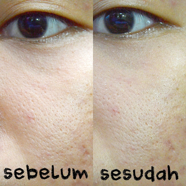 Tampilan pori-pori? Tersamarkan setelah menggunakan foundation [maap lagi lupa fotoin setelah pakai foundation wkwkwk gembel :((]. Kalo nggak pakai foundation, gue ga ngerasa dia bener-bener menyamarkan tampilan pori-pori. Bahkan ketika pertama kali dipakai ke wajah. Tapi produk ini bikin tampilan terlihat matte dan tekstur wajah jadi halus. Sayangnya, gue nggak ngerasa produk ini bisa menahan minyak di wajah gue yang super berminyak. Jadinya ya nggak tahan lama juga. Bikin pori-pori makin kelihatan. Geli banget liat pori-pori gue pas udah siang-siang lepek gitu. Gue hanya suka hasilnya ketika baru selesai makeup-an. Syedih :((