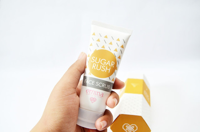 Sugar Rush Face Scrub dari Emina ini dikemas menggunakan box berbentuk prisma segi enam dengan perpaduan warna coklat kekuningan dan warna putih. Desain boxnya itu yang bikin gemes! Antimainstream dan bikin gue gamau buang boxnya hahaha. Kalau desain botolnya sendiri, mirip sama desain varian skincare Emina lainnya, yah, seperti face wash dan sun protection-nya. Tapi untuk yang face scrub ini nuansa warnanya sama seperti boxnya, coklat kekuningan juga. Tutupnya modelan flip gitu jadi aman lah, ya, untuk dibawa-bawa, dan bisa atur pengeluaran produknya juga. Ukurannya juga cukup mungil, standar kemasan face wash pada umumnya.