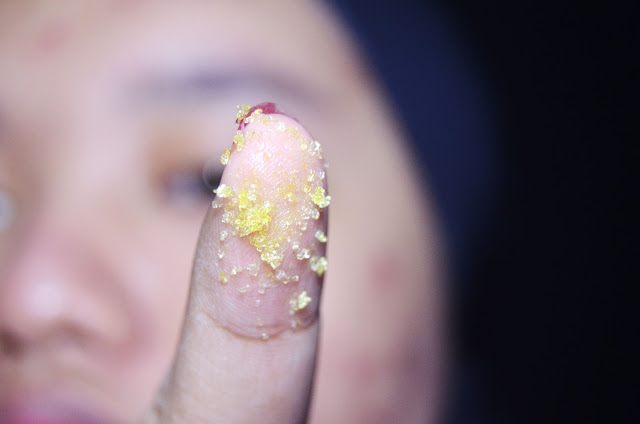 Pas dibuka, langsung terlihat butiran gula berwarna kuning di dalam jar-nya. Aromanya campuran gula sama lemon (yea ofkros, Ti, ofkros). Literally, butiran gula. Bukan yang butiran gula yang padat gitu (?). Aduh bingung jelasinnya. Lihat sendiri di foto, ya, wkwkwk.