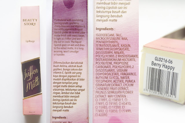 Walau mungkin formulanya kurang memuaskan, gue tetap cinta banget sama Beauty Story Chiffon Matte yang warna Berry Happy ini. Karena warnanya yang jarang banget disediain sama merek-merek lokal karena termasuk warna yang berani. Gue juga jarang banget sih dipakai keluar rumah, apalagi kalau dipakai siang-siang hahaha. Gue tetap mengapresiasi Beauty Story yang berani ngeluarin lipstik warna begini di Indonesia hihi. Semoga bakal ngeluarin warna aneh lagi, ya, Beauty Story! Ataau semua brand lainnya hihi :D