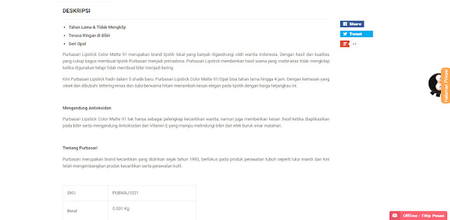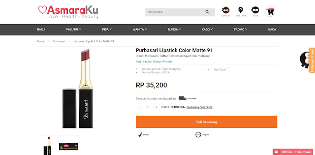 Pas pertama kali buka website-nya, gue langsung "disambut" sama CSnya melalui chat personal yang terdapat di webnya, layaknya e-commerce lainnya. Di chat tersebut kita bisa bertanya seputar produk yang dijual, atau bahkan konsultasi dengan kerahasiaan yang terjamin. Tadinya gue mau nyoba beli lingerie, tapi karena gue masih belum siap memakai pakaian dalam seperti lingerie--((belum siap)) --untuk percobaan belanja di AsmaraKu pertama kali, gue akan beli produk lain yang dijual di AsmaraKu. Tak lain dan tak bukan adalah.. kosmetik! Hahaha! Karena gue cukup terkejut stok gincu Purbasari lengkap banget, semua shade termasuk yang warna terbaru. N t a b z.