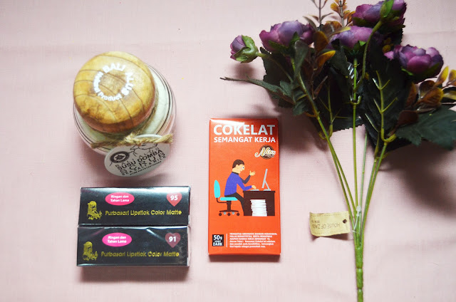 Iya, Cokelat Semangat Kerja :)) Btw ini coklatnya enak banget, dark chocolate yang gak terlalu manis gitu. Sukaak! Murah meriah lagi hihi. Kalau lipstik dan lulurnya, nanti bakal gue ulas di postingan lain, yaa :)