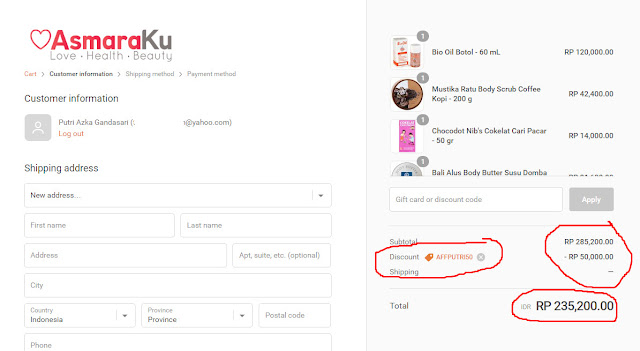 Secara keseluruhan gue suka banget belanja di AsmaraKu. Hanya saja karena gue ini lebih senang belanja makeup dan perawatan, jadi gue ngerasa untuk produk kecantikan masih kurang koleksinya. Semoga akan terus bertambah, ya, biar makin asyiikk. Tapi karena emang AsmaraKu ditujukan untuk pasutri, menurut gue udah lumayan banyak produk-produk kebutuhan pasutrinya. Buat teman-teman yang pengen nyoba belanja di AsmaraKu juga, kalian bisa pakai kode voucher gue ya "AFFPUTRI50" di kotak gift card or discount code, nanti langsung kepotong IDR 50.000 untuk pembelian minimal IDR 200.000. Berlaku sampai tanggal 31 Maret 2017, yaa :)