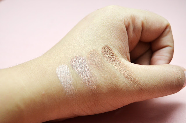Ini juga salah satu produk yang bikin gue exciteddddd karena pas pertama kali dikasih lihat warna-warnanya omaygat I'm in lovee T_T Cantik-cantik banget. Warna-warnanya netral banget untuk dipakai sehari-hari maupun untuk dipakai di acara resmi. Terdiri dari tiga warna shimmer dan satu warna matte. Mau hanya pakai satu warna atau dikombinasikan warnanya tetap terlihat oke, karena aduuhh warna shimmer-nya aku suka sekalii.
