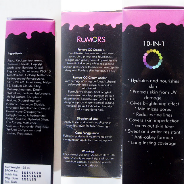 Sebagai simpulan, gue suka sama Rumors CC Cream ini karena super ringan dan nggak ada kesan lengket di wajah. Finish-nya juga glowing banget bikin wajah gue terlihat sehat, walaupun gue harus tetap set pakai bedak karena kulit gue jenisnya berminyak. Nggak bikin kelihatan cakey atau dempul. Bisa meratakan warna kulit sesuai fungsinya sebagai CC cream. Hanya saja gue nggak begitu memfavoritkan desain kemasannya dan nggak ada penjelasan SPF berapa yang terkandung dalam produk ini. Yang gue nggak suka sih klaimnya banyak banget tapi nggak semua klaim sesuai dengan realita. Tapi gue masih memaafkan karena ini kan CC cream, bukan foundation. Kalau foundation mungkin gue akan kecewa berat ya hahaha. Ketahanannya biasa aja buat gue yang kegiatannya nggak di ruangan ber-AC dan seringnya bahkan di luar ruangan. Kalau teman-teman kegiatannya di tempat ber-AC mungkin bakal lebih awet. Wanginya memang agak mengganggu tapi bakal hilang kalau sudah dipakai ke wajah setelah beberapa menit. Walau hanya memiliki satu shade, ternyata shade ini nggak bikin kulit terlihat pektay atau terlalu putih di kulit gue yang tone-nya medium. Lama-lama dia nyatu sama warna kulit kok. Oh iya, Rumors CC Cream juga nggak bikin kulit gue breakout! Yayyy senang senang! :D
