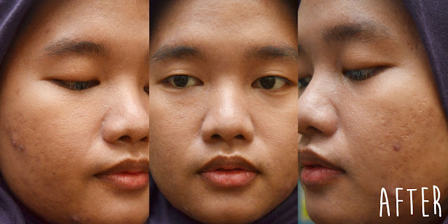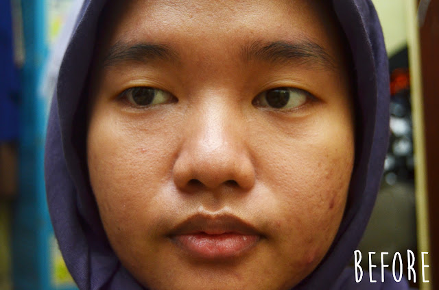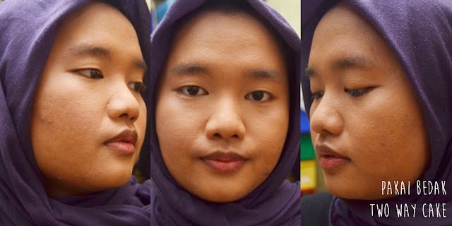 Karena dia nggak bisa menutup noda bekas jerawat di wajah gue, gue akhirnya tetap memakai concealer dan set semuanya menggunakan two way cake untuk menambah coverage. Yah lumayan, lahh. Oh iya di sini gue nggak pakai primer karena pengen lihat apakah dia beneran bisa mengecilkan pori-pori. Yup, itu nggak terjadi di wajah gue yang pori-porinya udah kayak kawah gunung hahaha. Well gue nggak mengharapkan produk ini bisa menyamarkan pori-pori, sihh.