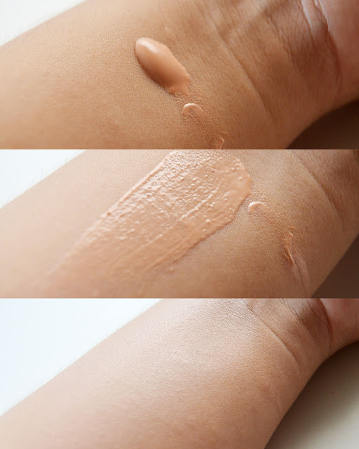 Tekstur produknya sendiri cukup cair dan ringan. Ada wanginya, ya. Lumayan ganggu sih buat gue, tapi nggak yang bikin gak betah gitu wanginya. Jadi masih bisa ditolerir. Mudah sekali dibaurkan. Karena hanya memiliki satu shade, awalnya gue takut ini bikin abu-abu. Soalnya pas pertama kali gue coba keluarin produknya, ini tuh pink undertone banget. Mungkin karena dia mau memberikan efek mencerahkan (brightening) makanya warnanya agak pink. Tetap takut juga sih nantinya malah bikin wajah gue jadi abu-abu mengingat katanya dia memiliki fitur dapat menutup kekurangan di wajah.