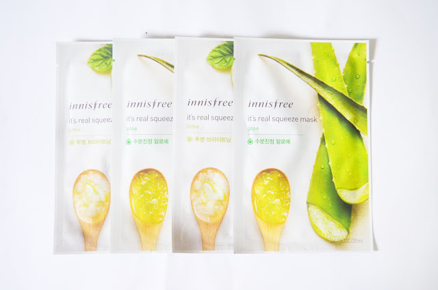 Gua rasa, kalo ke Innisfree kagak beli masker kertas itu kayak ada yang kurang gitu ya hahaha. Gue bahagia banget kalo ke bagian masker kertas. Koleksinya banyaaakkk banget. Nggak hanya yang It's Real Squeeze Mask, ada juga Anti-Aging Mask (buat under eye, pore care, dll) dan Skin Clinic Mask (Collagen, Vita C, Hyalluronic Acid, dll). Berhubung Anti-Aging Mask dan Skin Clinic Mask-nya lumayan yha harganya haha jadinya gue beli yang It's Real Squeeze Mask aja. Itupun gue hanya membeli varian Lime dan Aloe doang karena dua jenis ini agak sulit ditemukan di online shop. Cepet banget habisnya! Yang Lime ini sebenarnya buat mencerahkan, tapi gue beli ini hanya karena gue pecinta lemon kelas berat jadi yaudadeh hahaha. Kalo Aloe katanya sih bagus untuk menenangkan kulit yang habis terbakar sinar matahari. Gak juga sih, bagus juga kok buat yang kulitnya lelah. Kulit juga bisa lelah loh gengs. Kasihan, kudu diperhatiin juga ;)