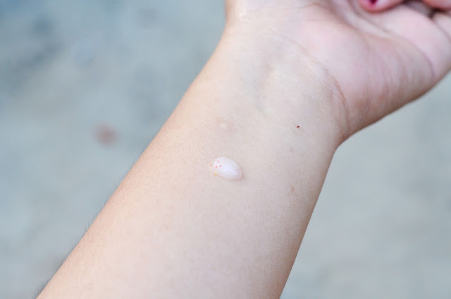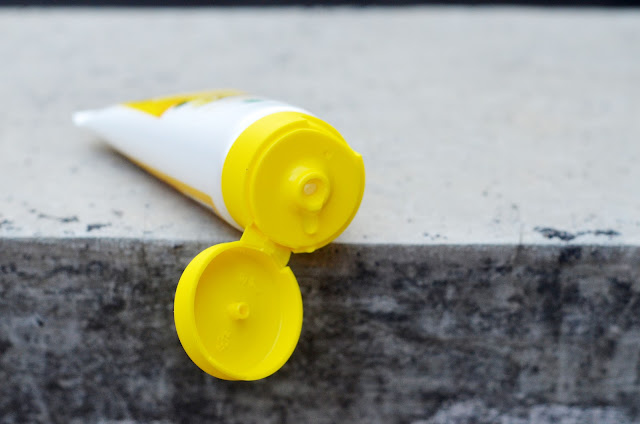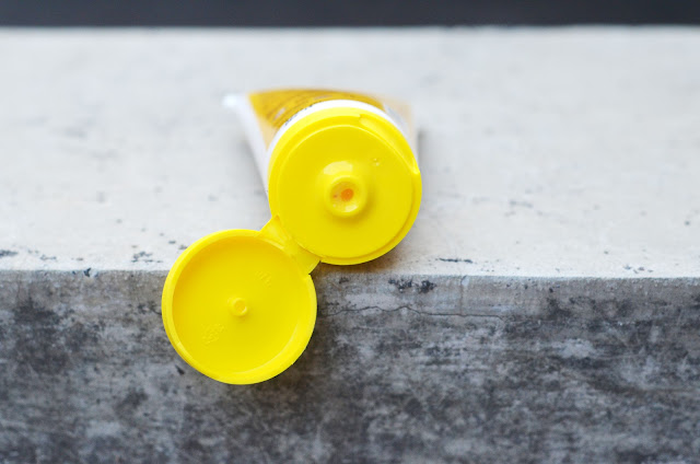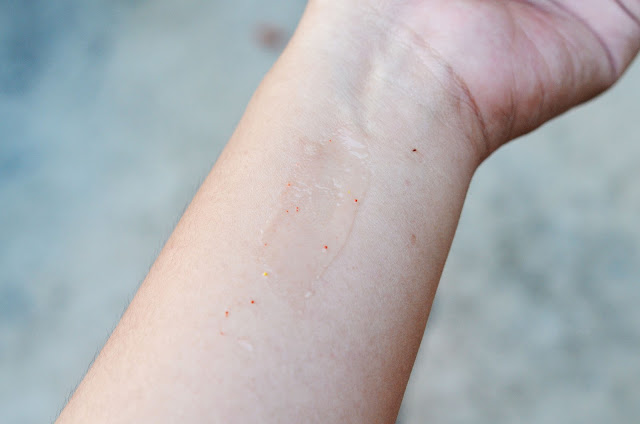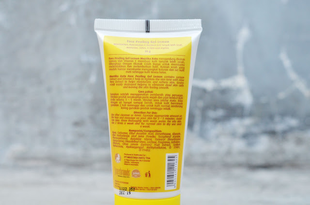 Ini salah satu yang paling menarik perhatian gue. Peeling gel, merek lokal? Wuuuu patut dicoba lah. Kemasannya flip biasa dengan tube yang lumayan besar mempermudah pengeluaran produk. Didominasi warna kuning dan putih. Pas dibuka, wangi lemonnya langsung keluar. Awalnya gue udah khawatir bakalan nyengat, tapi ternyata nggak terlalu menyengat. Teksturnya seperti gel dengan warna putih keruh, dan ada butiran warna kuning dan oranye di dalamnya. Saat dibaurkan warna putihnya menjadi transparan.