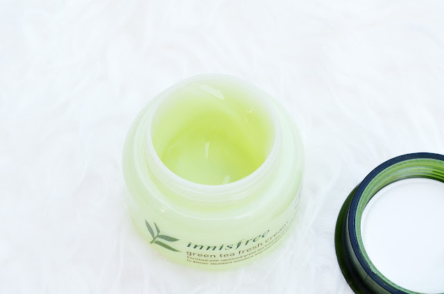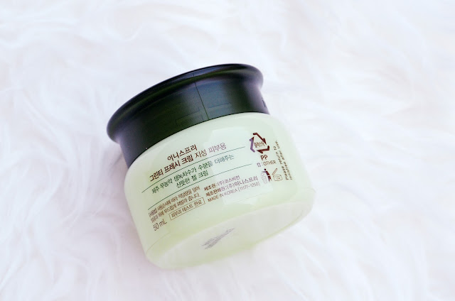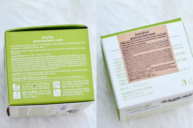 Green Tea Fresh Cream ini memiliki kemasan seperti pelembap varian Green Tea pada umumnya, hanya saja perbedaannya terdapat pada warnanya, yaitu berwarna hijau muda dengan tutup ulir berwarna hijau tua dan ada tulisan "Innisfree" di sampingnya. Jar ini berukuran 50ml tanpa tersedia spatula di dalam box-nya, tetapi ketika masih baru ada segel berwarna putih di bibir jar. Maaf ya nggak ada fotonya soalnya ini gue foto setelah beberapa kali pakai haha. Nggak sabaran, sih xD Ukurannya mungkin agak bulky untuk dibawa traveling tapi masih aman karena bahannya plastik yang cukup kokoh. Di bagian bawahnya ada tulisan tanggal kedaluwarsanya. Box-nya juga lucu, lho, bentuknya. Senada dengan jar-nya, didominasi warna hijau muda yang memberi kesan segar. Makanya ini box nggak pernah gue buang dan produknya selalu gue simpen lagi ke dalem box setiap setelah memakai produknya hahah.