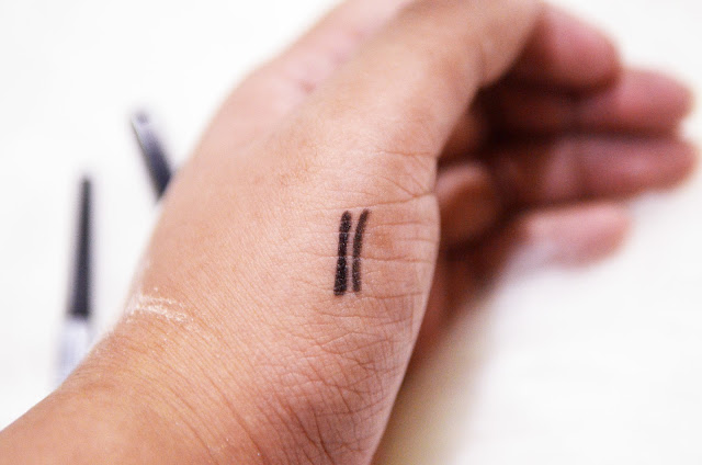 Gambar di atas itu swatch-nya. Yang kanan satu kali swipe, dan yang kiri dua kali swipe. Mirippp banget sama tekstur eyeliner. Tapi kalau dibilang eyeliner pun ini termasuk kurang pekat, walau cukup smooth saat nge-swipe produknya di tangan.