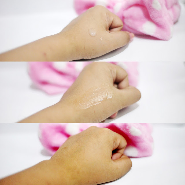 Konsistensinya seperti gel, warnanya putih butek gitu, dan nggak ada wanginya. Gue pakai satu setengah pump untuk ke seluruh wajah. Mudah meresap ke kulit.