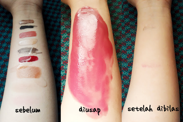 Nah foto di atas ini gue mengaplikasikan beberapa produk makeup di tangan gue (iya itu tangan percaya aja ya). Di sana ada Innisfree Skinny Waterproof Mascara yang sebenarnya mudah sekali dihapus pakai cleansing oil yang biasa gue pakai, dan ada BLP Lip Coat yang menurut gue agak susah dihapusnya jadi harus pakai makeup remover yang oil based. Sisanya produk yang gampang dihapus pakai micellar water sekalipun.