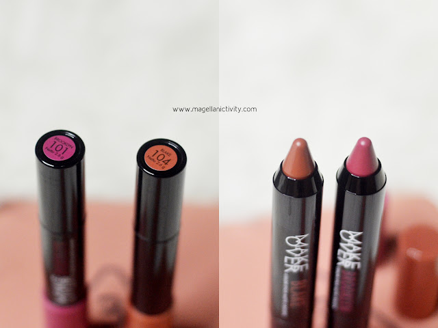 Make Over Color Stick Matte Crayon ini memiliki 5 shade bernuansa nude dengan tone yang bervariasi. Seneng akuloh jadi gampang kalo mau milih nude shade yang kira-kira bakal cocok di kulit akuuhh. Soalnya gue ini termasuk susah nyari warna nude yang cocok dari segi warna maupun formula. Dan gue cukup impressed dengan koleksi warnanya yang terbilang pas banget. Ada yang nude pucet, pinkish nude, brownish nude, peachy nude, bahkan warna brownish purple. Kebetulan gue dapat shade 101 Brooklyn dan 104 Blake yang merupakan warna tergelap di shade range-nya. Seneng banget karena sepertinya bakal cocok di skin tone gue yang medium-tan.