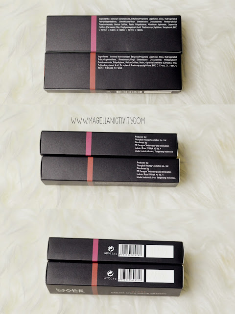Make Over Color Stick Matte Crayon ini terdapat box yang ukurannya lebih besar dari isi produknya. Nggak tahu kenapa, mungkin nggak ada box yang seukuran sama produknya hehe. Di box-nya ini seperti yang gue bilang sebelumnya, didominasi warna hitam namun terdapat aksen warna sesuai shade yang ada di dalam produknya. Informasinya juga cukup lengkap dari ingredients, tanggal kadaluarsa, nama shade, dan lokasi produksi. Hanya saja tidak ada deskripsi produk di kotaknya. Dusnya ini cukup terasa kokoh dan tidak mudah rusak.