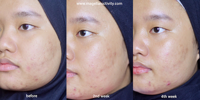 Di minggu keempat di foto kalian bisa lihat ya ada beberapa jerawat di wajah gue yang bermunculan, terutama rahang dan dagu. Again itu foto diambil saat gue sedang menstruasi, jadi ya itu emang jerawat hormonal aja. Kulit gue juga makin glowing dan cerah, ditambah merah-merah di pipi gue yang tadinya masih ada di minggu kedua, di minggu keempat ini udah hilang! Ah gilaa seneng banget!