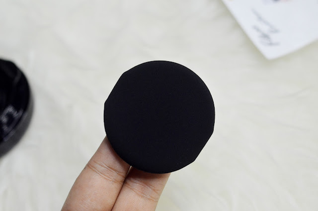 Aplikatornya berupa puff biasa dengan ukuran pita yang tebal, bikin nyaman ketika melakukan pengaplikasian produk. Ukuran puff-nya juga pas, nggak terlalu besar dan nggak terlalu kecil. Buat ukuran jari gue yang gede ini masih terbilang nyaman lah. Warnanya hitam jadi kalau kotor nggak terlalu keliatan kotor banget huweheh. Oh iya, jangan lupa untuk bersihin puff-nya setiap beberapa kali pakai, supaya bakterinya nggak numpuk di puff. Dia juga nggak terlalu banyak menyerap produk, makanya ambil dikit aja udah bisa dipakai ke banyak area wajah dan mampu menutup area wajah yang ingin ditutupi.