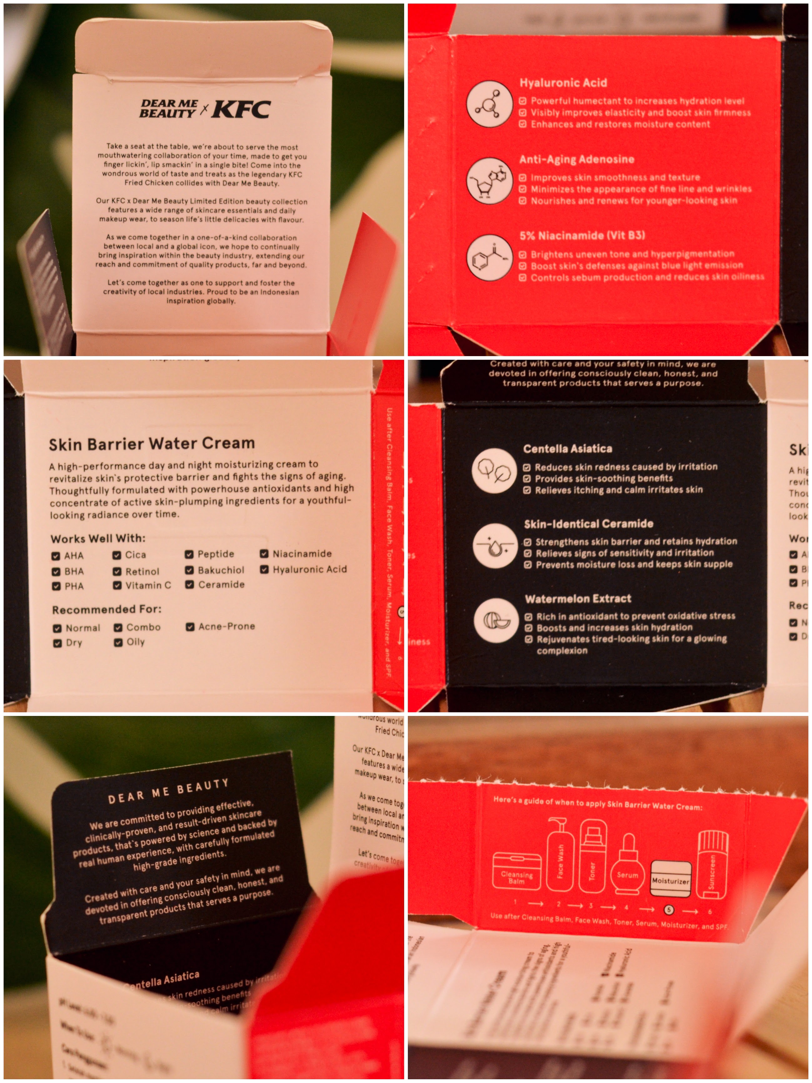 Seperti biasa, Dear Me selalu niat untuk memberikan informasi seputar produk di kotaknya. Mulai dari deskripsi produk, klaim-klaimnya, komposisi, cara pakai, sampai detail step dan kandungan apa aja yang bisa digabung bila menggunakan produk ini. Informasinya nggak hanya di bagian luar kotak, tapi sampai ke dalemnya juga. Salut banget sih gue. Kalau dari segi desain, gue suka-suka aja, sih. Perpaduan warna hitam, putih, dan merah ternyata oke juga. Ada logo KFC di bagian kotak tentunya.